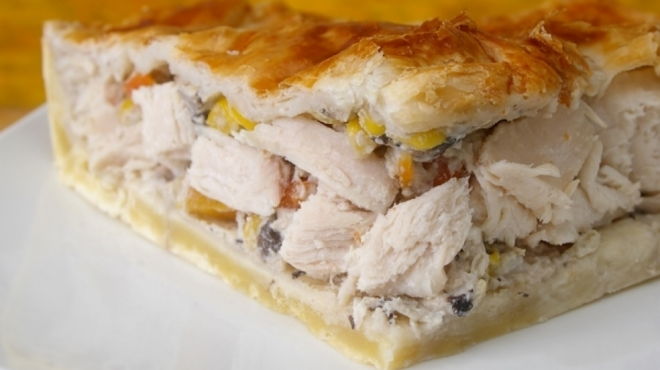 Омесете тесто от пресятото брашно, содата, малко сол и вода. Полученото тесто разточете на 2 по-дебели листа - единият да е по-малък, за отгоре.задушете до омекване в мазнината накълцания лук, а след това добавете измития ориз, нарязаните ситно копър и чубрица, червен пипер и малко сол на вкус.В намазнена тава сложете по-големия разточен лист - краищата му трябва да увиснат извън тавата. Разпределете плънката с ориз, отгоре порционираното пиле, което по желание може да обезкостите предварително. Прегънете навътре краищата на листа и покрийте с втория лист тесто. Притиснете леко краищата.Намажете пилето лучник с мазнина и сложете да се изпече в средно силна фурна. Поднесете ястието със салата по избор.