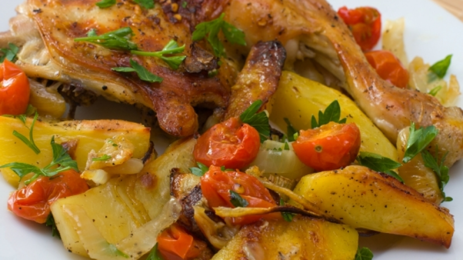 Измиваме и подсушаваме бутчетата. Подреждаме ги в тавичка, която предварително сме намазали с масло. Приготвяме марината за бутчетата от 2-3 с.л. лимонов сок, черен пипер и сол и с нея ги намазваме.Картофите нареждаме около бутчетата цели или срязани на две. Поливаме ги със зехтина.Заливаме яститето с бялото вино и печем в предварително загрята на 200 градуса фурна за около 50 минути. Доматите се обелват и нарязват на малки кубчета, които прибавяме при пилешкото и картофите и запичаме за още 15 минути.Поднасяме наръсено със смес от ситно нарязани зелени подправки.