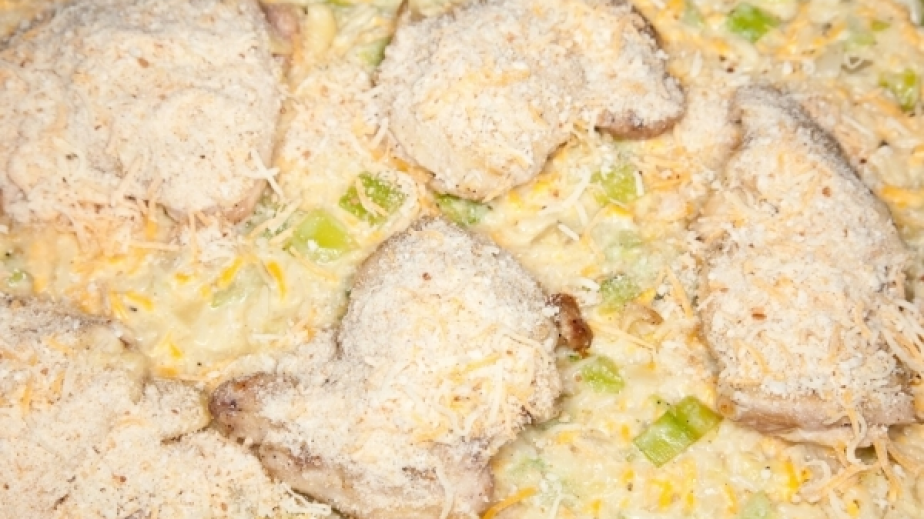 Начукайте леко пилешкото и добре го овкусете със сол, черен пипер и бял пипер.Загрейте мазнина в тиган и запържете пържолките равномерно от двете страни. Извадете ги и долейте още малко олио. Запържете накълцания праз и настъргания морков и ги овкусете с подправки.В йенска тава с капак направете канапе от запържените зеленчуци. Отгоре подредете пържолите и залейте с виното. Върху тях разпределете филийки топено или пушено сирене.Обилно поръсете с настъргания кашкавал, пармезан и Чедър. Сложете капака за йенската тава и сложете да се пече за 15 минути в силно загряна фурна.След това махнете капака, намалете малко фурната и доопечете до лек загар.