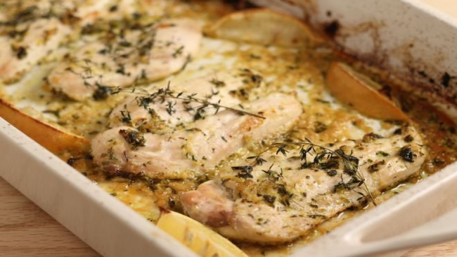 Загрява се фурната на 200 – 220С. В хаванче (или купа) се счукват пресните подправки и зехтина. Не се ситнят подправките, просто се накъсват грубо. Така ще пуснат аромата си най-добре. С пръсти се загребва малко от сместа и се масажира в месото нежно, докато се покрият отвсякъде. Може да се оставят да починат час-два. Подрежда се тавата. Сплескват се необелените скилидки чесън с плоското на нож натиска се с длан силно и се слага в тавата. Нарязва се лимона на кръгчета и се нареждат отгоре, за да не изсъхва пилето, докато се пече. Пече се в средата на фурната, докато месото стане златисто. Сервирайте с гарнитура по желание.