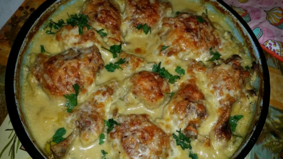 Почистете пилешките бутчета и ги разполовете на горно и долно бутче. В купа сложете майонезата, зехтин, подправката за пиле, черен пипер и топеното сирене.