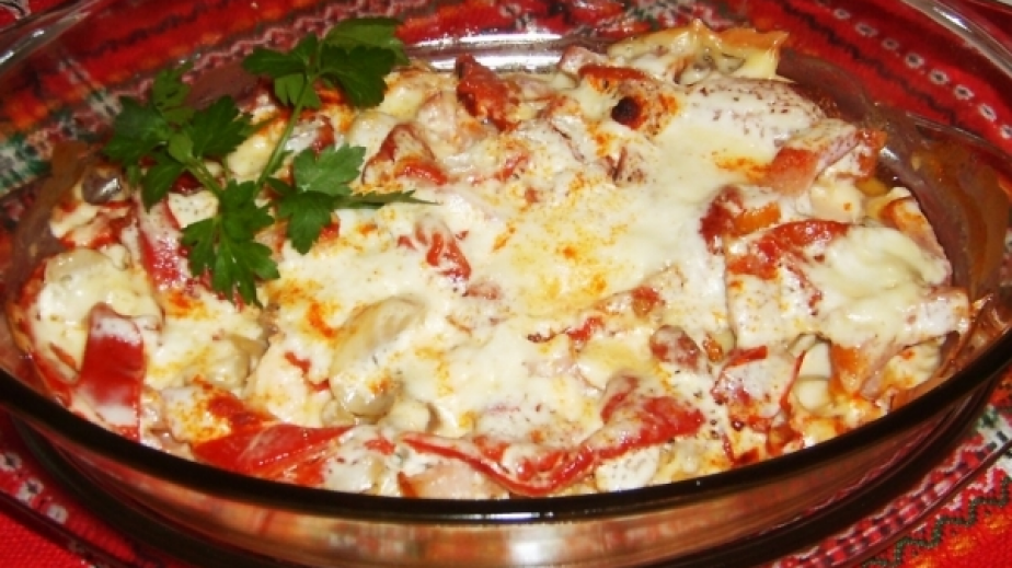 Филето, беконът и чушките се нарязват на ивици и се слагат в огнеупорен съд. Върху тях се подреждат гъбите и парчетата топено сирене.