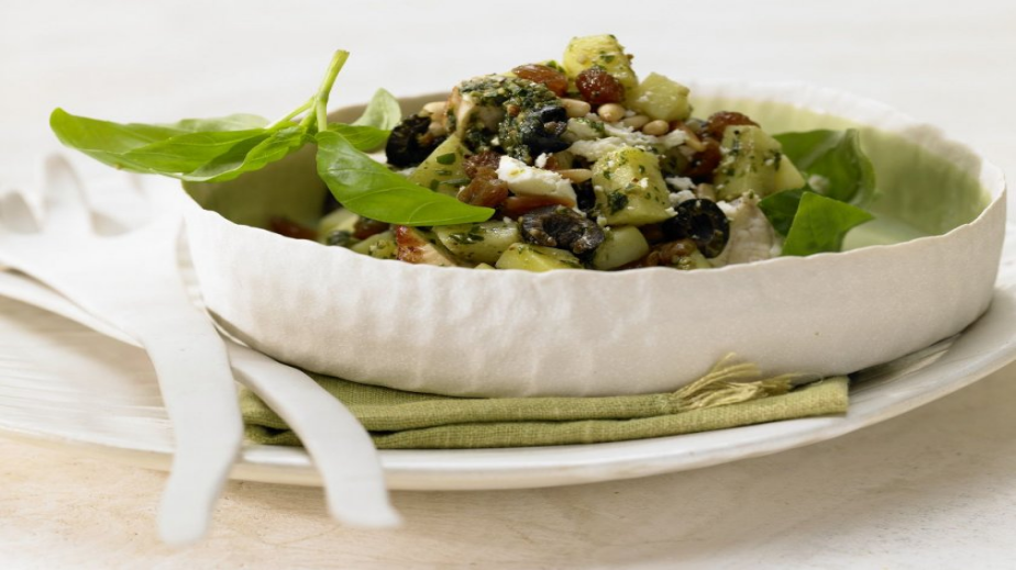 Кедровите ядки се запичат на сух тиган и се смесват с маслините и изстисканите стафиди, нарязани на едро.