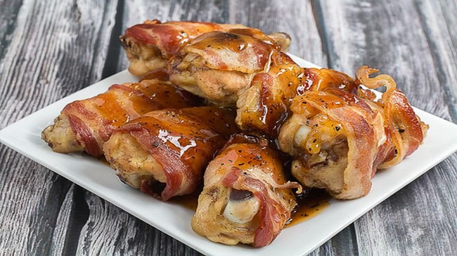 Завиваме пилешките крилца с бекон и ги слагаме в дълбок съд. Към тях прибавяме марината, направена от олио, мед и соев сос. Оставяме да престои в хладилника 30 мин. Изваждаме пилешките крилца от маринатата и ги печем 30 мин във фурна, предварително загрята на 200º. Сервираме ястието, гарнирано с пържени картофи или салата.