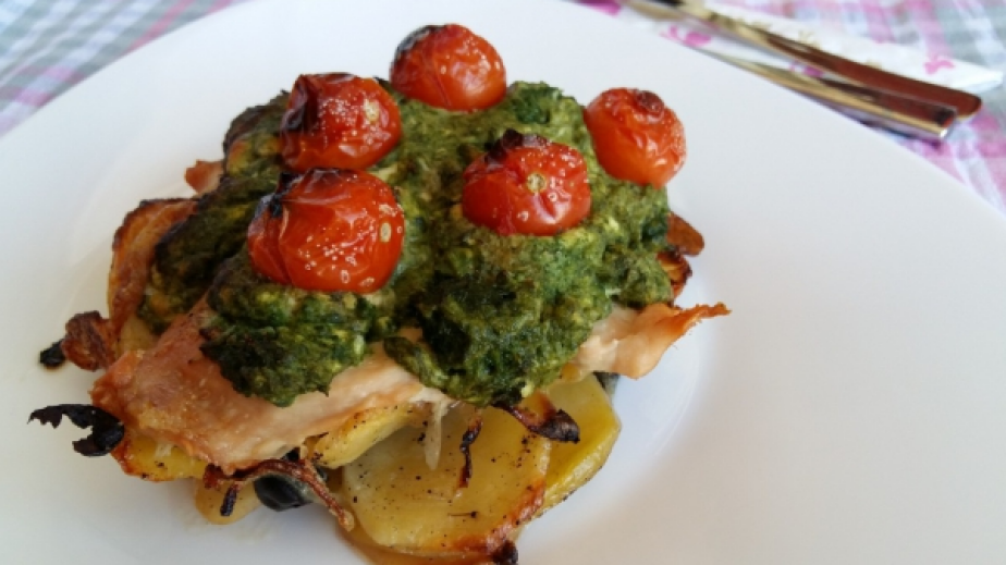 Застелете една тава с хартия за печене и разпределете картофите със зеленчуците на 4 купчинки (по разстлани). Запечете за 20 мин в загрята на 200 градуса фурна. Междувременно изтънете (начукайте) малко пилешките гърди.