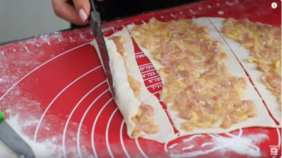 Омесете тестото, разделете го на 15-15 парчета, поръсете всяко с брашно и го разточете много тънко. После го нарежете на три ленти и разпределете пълнежа врху всяка, като отстрани оставяте по сантиметър свободно място. Навийте лентичките на рула и с нож нарежете на парчета около 5 см.