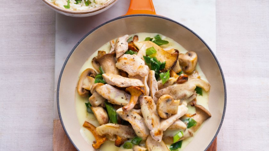 Оризът се сварява за 8-10 мин. Гъбите се нарязват едро според големината. Пилешкото филе се нарязва на ивици. Пресният лук се нарязва косо на малки пръстени.