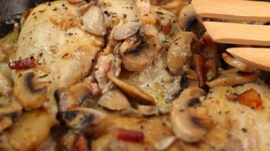 Поръсете с нарязаните гъби, наредете отгоре резени топено сирене Разбъркайте заквасената сметана с водата и виното.