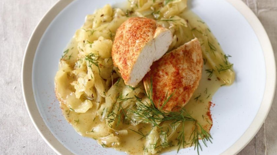 Пилешкото се изсипва върху зелето, похлупва се и без да се разбърква се готви под капак още около 5 мин. Поръсва се с наситнен копър.