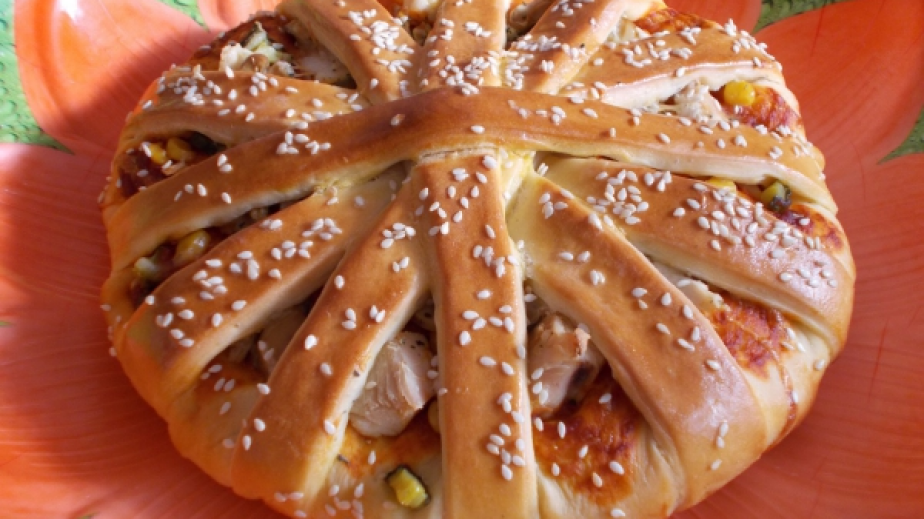 Настъргвате кашкавал и от малката част тесто режете ленти, които кръстосвате отгоре. Оставяте трите питки да втасат, мажете с жълтък, поръсвате със сусам и печете в загрята фурна