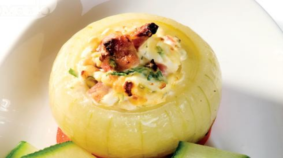 3.Яйцата се нарязват на ситно и се объркват с майонезата, копъра и бекона. Подправят се със сол и пипер на вкус. С получената смес се напълват лучените “буренца”. Запичат се 15-20 мин. в загрята фурна на 200° С, или докато се зачервят./Рецепта на menumag.bg