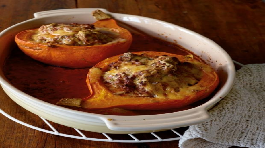 Половинките тиква се напълват с месната смес, слагат се в тавичка, сипва се доматеният сос.