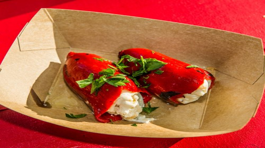 Салата от печени чушки и орехи върху краставица