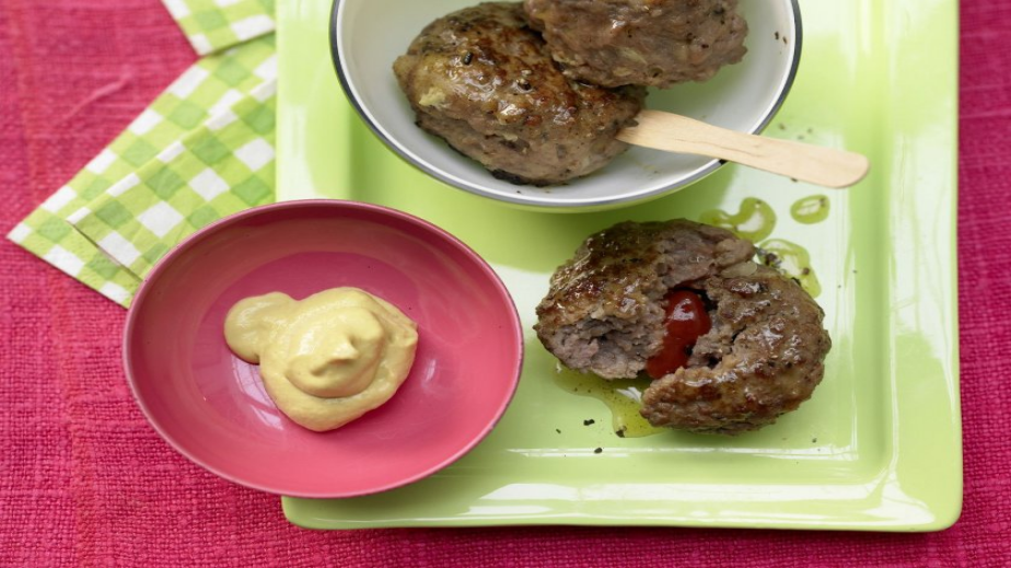 Прави се с пръст малка дупка във всяко кюфте. Пълни се с кетчуп и горчица с шприц или лъжичка и се затварят кюфтетата.