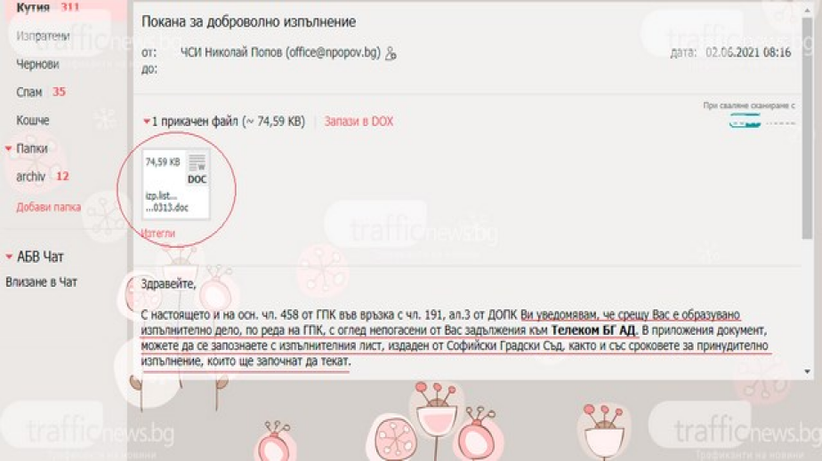 Хакери използват имената на действащи частни съдебни изпълнители за нова онлайн измама. Читател на TrafficNews сигнализираха за съмнителен имейл, в които е получил покана за доброволно изпълнение.