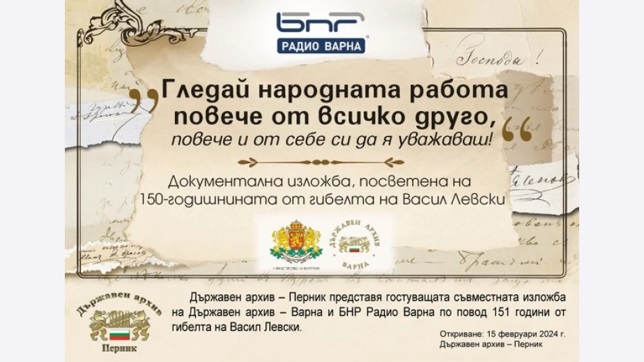 На 15 февруари от 11 часа в Държавен архив- Перник ще бъде представена гостуващата съвместната изложба на Държавен архив – Варна и БНР Радио Варна по повод 151 години от гибелта на Васил Левски.