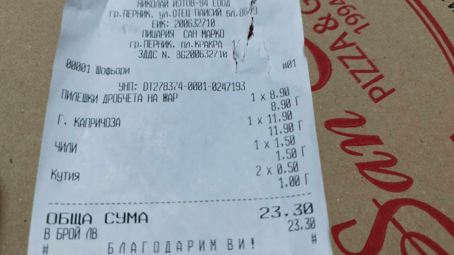 От касовия бон се вижда че храната е поръчана от пицария „Сан Марко“ в центъра на Перник. В нея на първо място са записани пилешки дробчета на жар, а в края на бележката е видна и датата и часа на доставката – 17 юли 2023 в 22:19ч.