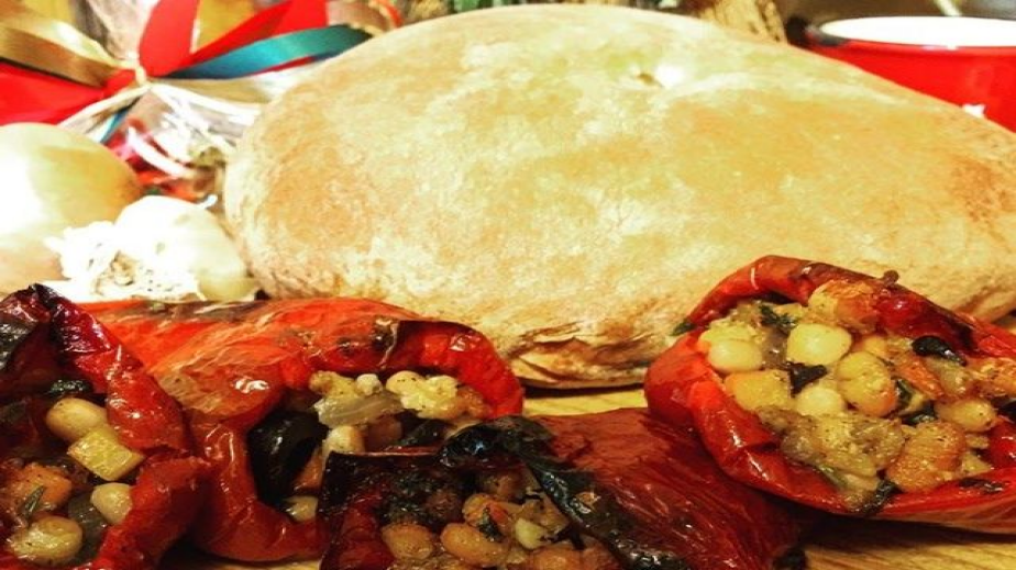 Разбъркайте добре и прибавете нарязаните маслини и подправките. След няколко минути махнете плънката от котлона и напълнете чушките. Наредете ги в глинена тавичка (или друга подходяща за печене). Прибавете малко количество вода и печете в предварително загрята фурна на 180 градуса за около 30 минути./Рецепта на az-jenata.bg