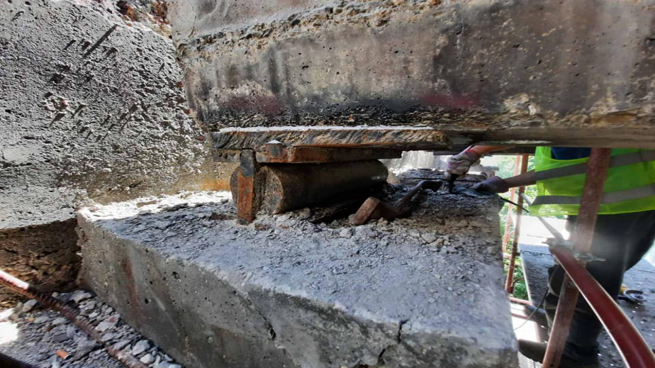 Мостовата конструкция се повдига и поддържа със специализирана техника. След изрязването на старите лагери и подготовката на „легло“ се поставят новите, които са изработени в Италия.