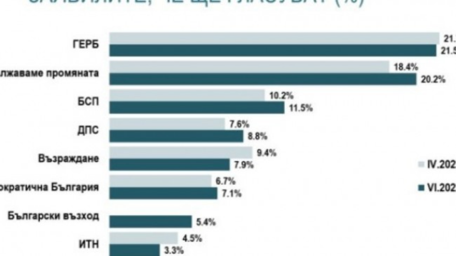 Сръст от 2 пункта спрямо април и 20,2% потенциален вот, "Продължаваме промяната" остава на малко над процент след ГЕРБ (21,5%). "Продължаваме промяната" постига ръст в столицата и няколко големи града, ГЕРБ запазва подкрепата си в по-малките областни центрове и селища.