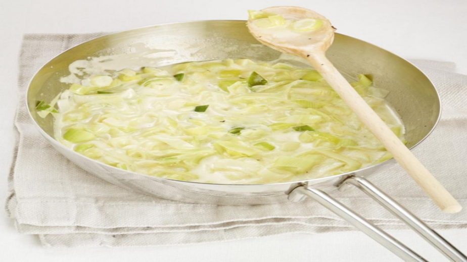 Празът се нарязва на шайби и се задушава в загрятото масло до омекване - да остане хрупкав.