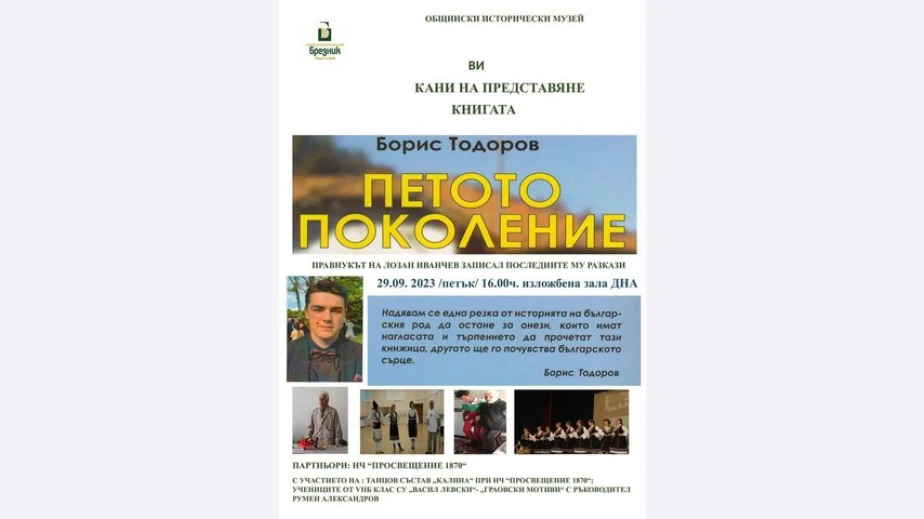 Представяне на книгата "Петото поколение" на Борис Тодоров ще се проведе утре в Брезник. За това съобщиха от Общинския исторически музей (ОИМ) в града, където ще се състои проявата. Партньор в организиране на представянето е Народно читалище (НЧ) "Просвещение 1870 г." Брезник.