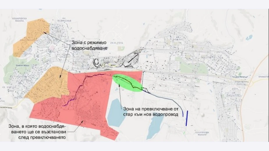 Зоните в червено на картата нямат възможност да бъдат водоснабдени от Градски резервоар и водоподаването ще бъде осигурено след приключване на строителните дейности.