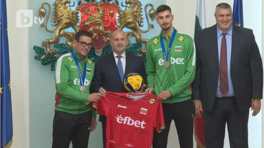 Всяко едно от момчетата от отбора, а и от щаба получи плакет с благодарности. Волейболистите подариха на Румен Радев топка и фланелка с автографи.