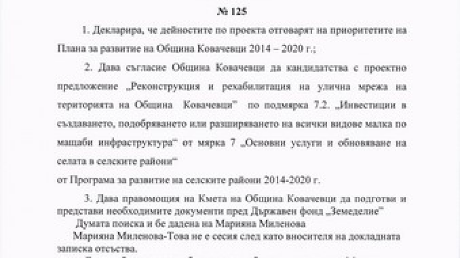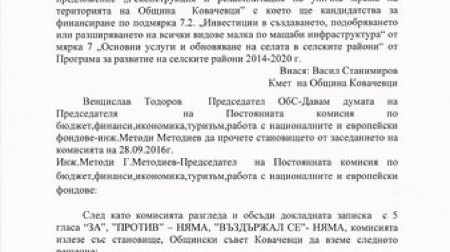 Във връзка с опровержение, направено от съветници от ГЕРБ и АБВ в Ковачевци по повод материал за проекти на общината, искам да покажа препис от протока от заседанието, проведено на 30 септември тази година, а на 29 септември както те твърдят. В него се вижда кой как е гласувал и какви изказвания е направил по време на сесията.