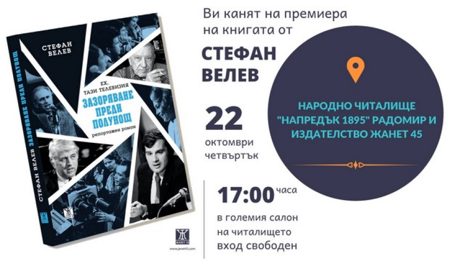 Книгата на журналиста Стефан Велев "Ах, тази телевизия. ЗАЗОРЯВАНЕ ПРЕДИ ПОЛУНОЩ" ще бъде представена в родния му Радомир. Събитието е на 22 октомври от 17 ч. в салона на читалище „Напредък“.