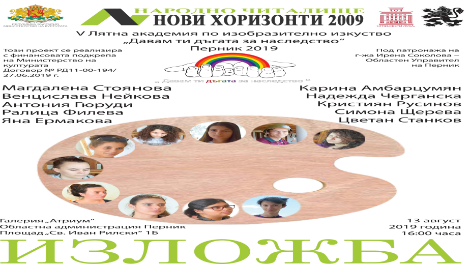 На 13 август 2019 година в 16:00 ч. в галерия „Атриум" на Областна администрация Перник ще бъде открита официално първата изложба с творби от V-тата Лятна академия по изобразително изкуство „Давам ти дъгата за наследство" Перник 2019.