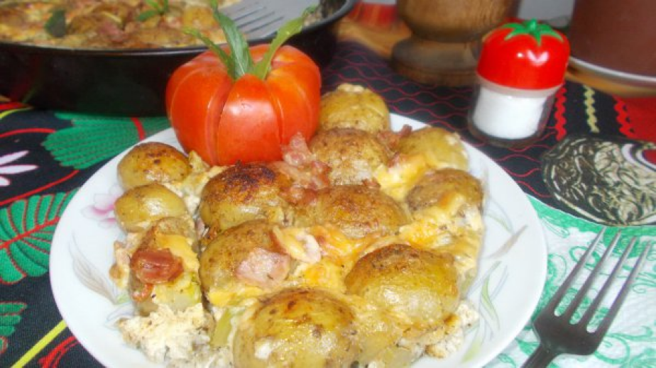 Измиват се пресните картофки, едрите се режат на две, малките остават цели с кората.