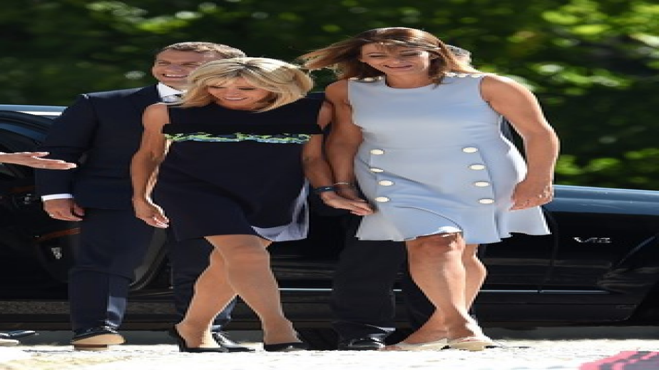 След слизането от колата на семейство Макрон, Деси поведе "колежката" си по червения килим за официалното посрещане, прихващайки я за ръка, а след това учтиво й посочи мястото за церемонията./ПИК