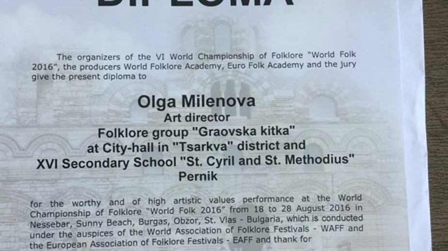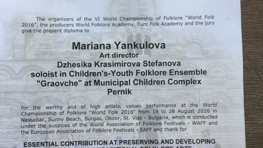Президентът на Световният шампионат по фолклор “World Folk 2016» Калоян Николов, в който се включват 280 фестивала с писмо до кмета Вяра Церовска е благодарил за поддържането и подобряването на условията за работа на групите за автентичен фолклор в Община Перник, което е помогнало за съхранението и развитието на това изкуство.