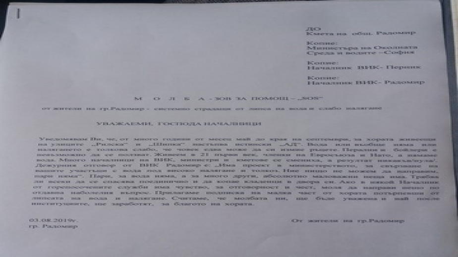 Радомирци от улиците „Рилска“ и „Шипка“, системно страдащи от безводие, са изпратили молба, придружена от подписка, до кмета на общината, МОСВ, директора на „ВиК“ Перник и началника на групата на водното дружество в града. „Зов за помощ- SOS“ са я озаглавили останалите на сухо в горещините като над 100 души, само малка част от потърпевшите, са се подписали под сигнала. Според живеещите на двете улици вода или няма, или е с ниско налягане и гражданите не могат да включат перални, бойлери, дори да си измият ръцете от години за период от месец май до края на септември.