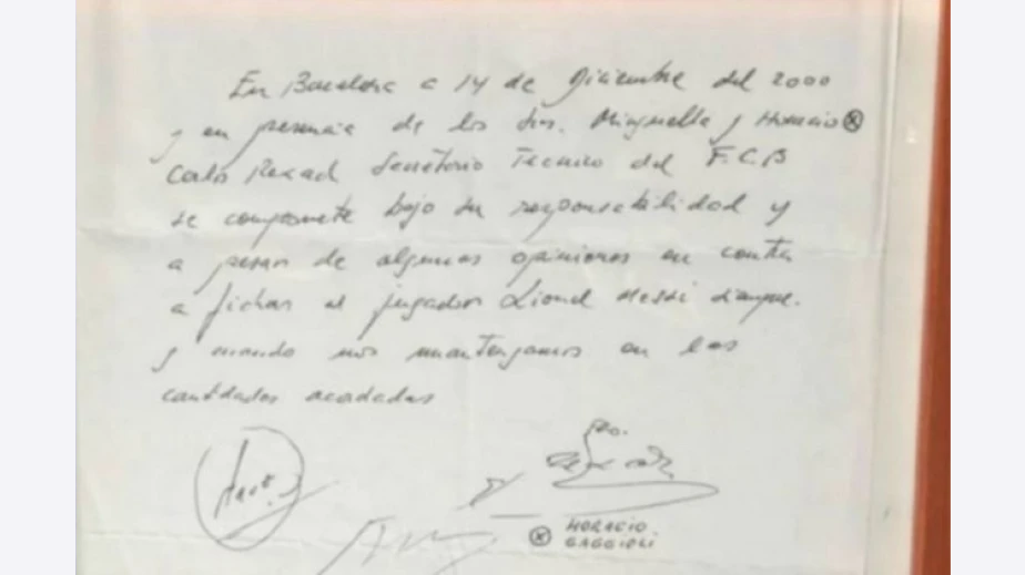 „В Барселона, 14 декември 2000 г., Карлес Рексач, спортен директор на Барселона, се съгласява, под пълна отговорност и независимо от противоположните мнения, да подпише договор с Меси при условие, че се придържаме към договорените суми“, пише на салфетката. /Източник: Лупа.бг