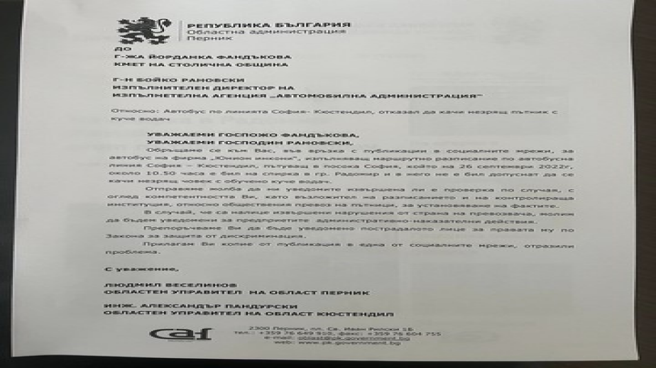 Пълна проверка на скандалния случай с незрящия радомирец, който не е бил качен в автобус от Радомир за София, разпоредиха областният управител Перник Людмил Веселинов и колегата му от Кюстендил Александър Пандурски. Случаят нашумя, след като бе разказан в социалната мрежа от журналиста Симеон Идакиев.