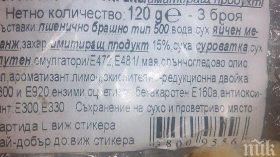 „Детето ми е в първи клас и искам да ви покажа какви безплатни закуски раздават в училище. На етикета пише какви съставки има в тези така наречени кифли със сирене. Може ли да дават на децата имитиращ продукт вместо сирене, а на всичкото отгоре и пълно със Е-та“, пита Десислава.