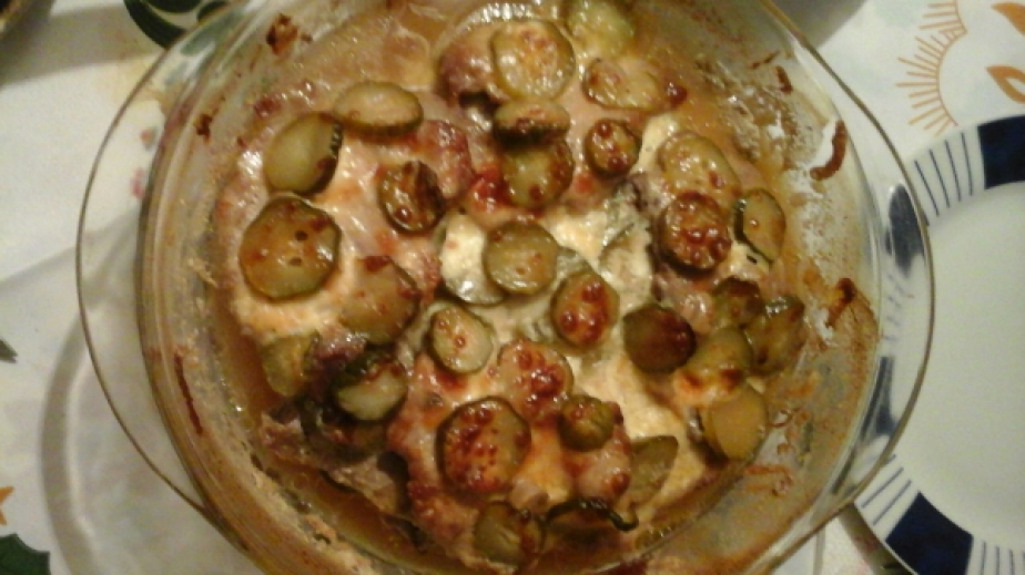 В йенската тавичка започваме да подреждаме пържоли, върху тях слагаме от киселите краставички, топено сирене и поръсваме с кашкавал.