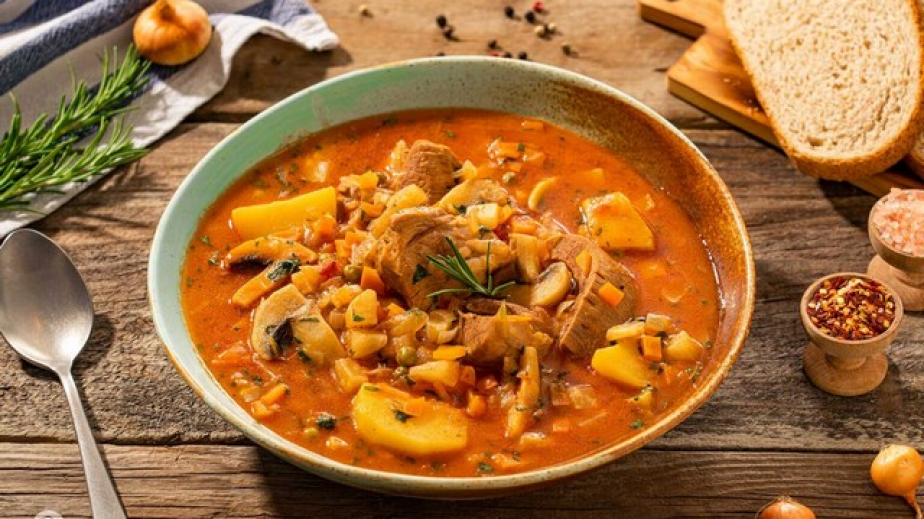 Щом зеленчуците омекнат, добавете виното, в което сте разбъркали брашното и доматеното пюре. Разбъркайте добре, налейте 1 л гореща вода и оставете да ври на умерен огън.