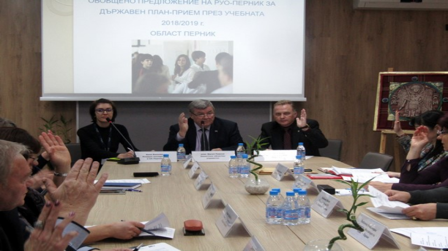 Комисията прие единодушно предложението за държавен план-прием за следващата учебна година, изготвено от Регионално управление на образованието – Перник. То предвижда разкриването на 30 паралелки с капацитет от 720 ученици в община Перник. За община Радомир – 6 паралелки с капацитет от 144 ученика. В общините Брезник, Земен и Трън по 1 паралелка с капацитет от 24 ученика.