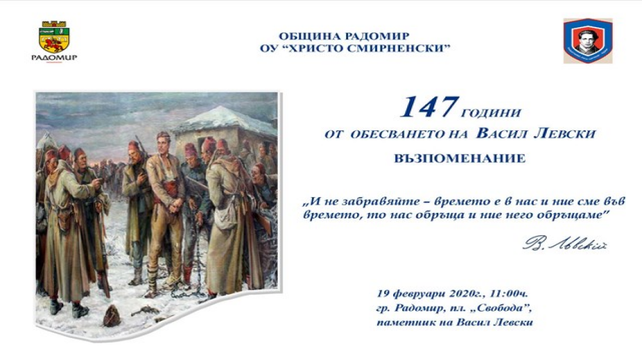 На 19 февруари (сряда) от 11:00 часа на площад "Свобода" започва официалната програма по повод 147-та годишнина от гибелта на Васил Левски. Фанфарният оркестър и ученици от ОУ "Христо Смирненски" ще изпълнят музикално-поетична програма в памет на Апостола. Деветгодишната Антония Станкова от ОУ "Иван Вазов" в село Извор ще рецитира стихотворението "Обесването на Васил Левски".