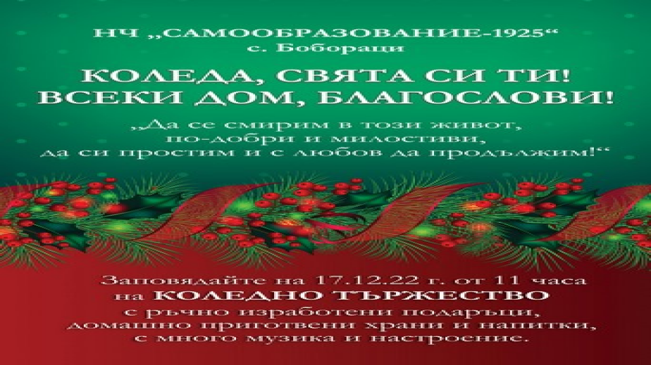 Радомирското село Бобораци организира Коледно тържество на 17 декември / събота/ от 11,00ч. То ще се проведе под надслов „Коледа, свата си ти! Всеки дом, Благослови!Да се смирим в този живот, по-добри и милостиви, да си простим и с любов да продължим!“.