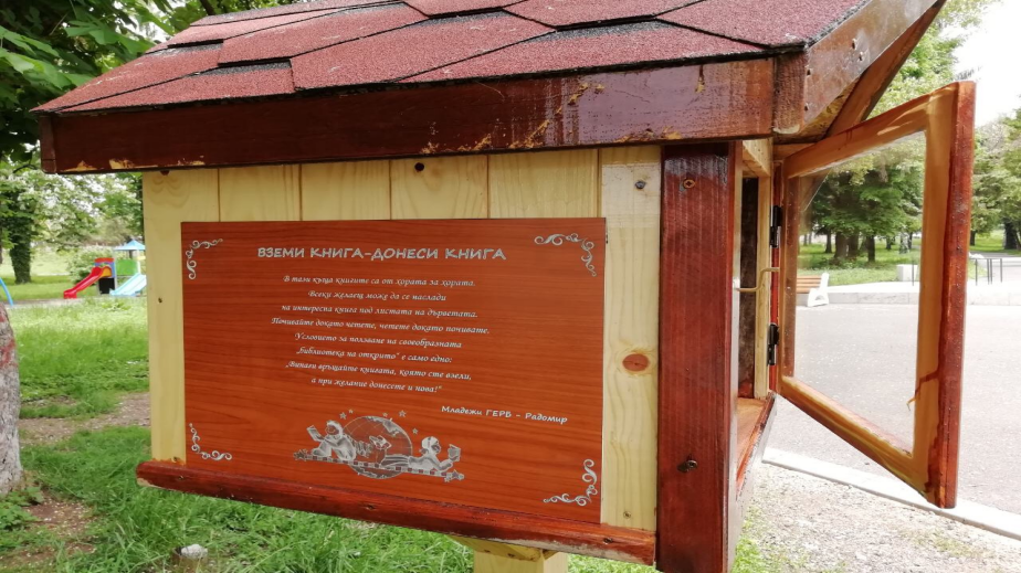 В навечерието на 24 май-Деня на българската просвета и култура и на славянска писменост бе открита първата библиотека на открито в град Радомир. Къщичката за книги е поставена по идея на Младежи ГЕРБ-Радомир и е разположена в Градския парк. В нея всеки гражданин може да прочете, да заеме или да дари книжка. Новата придобивка има за цел да обогати градското пространство, провокирайки интереса на малки и големи към словото, към книгата. Идеята е всеки желаещ да може да ползва книга от своеобразната библиотека на открито и фондът й да се обогатява постоянно с нови заглавия, също така тя да стане любимо място за срещи и разговори на жители и гости на Радомир.