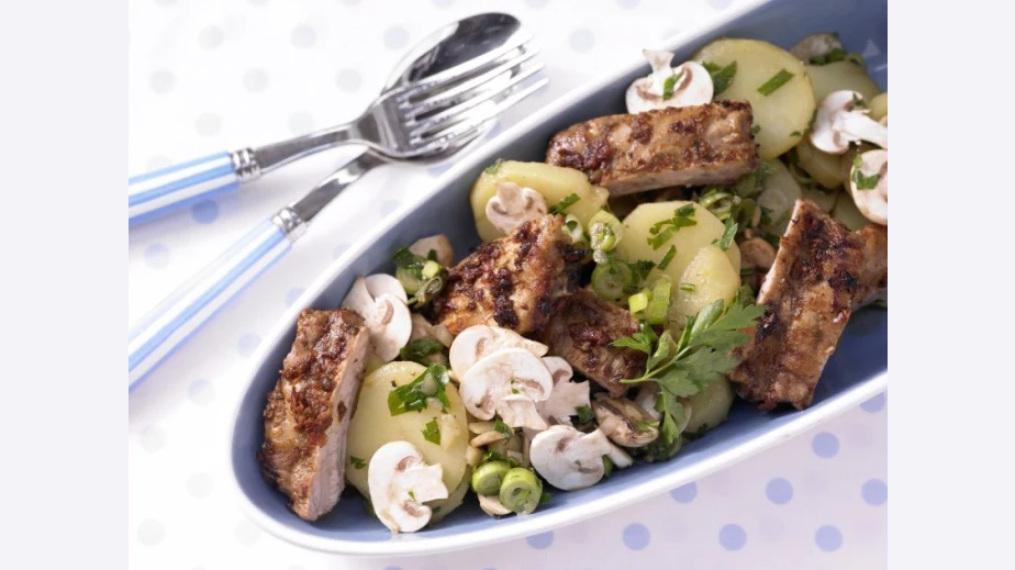 Картофите се нарязват и се смесват с гъбите, пресния лук, магданоза и дресинга.