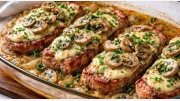 Свински пържоли с гъби и топено сирене