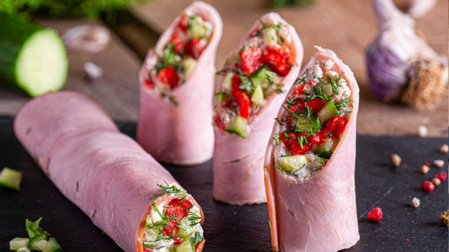 Сложете по 2 с. л. от сместа във всяка филийка шунка и навийте на руло.