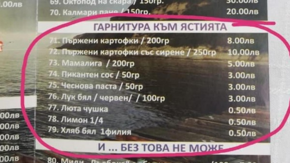 Снимка в социалните мрежи разбуни духовете, след като показа цена от 8 лв. за цената на пържени картофи. Случаят е от заведение край Каварна.