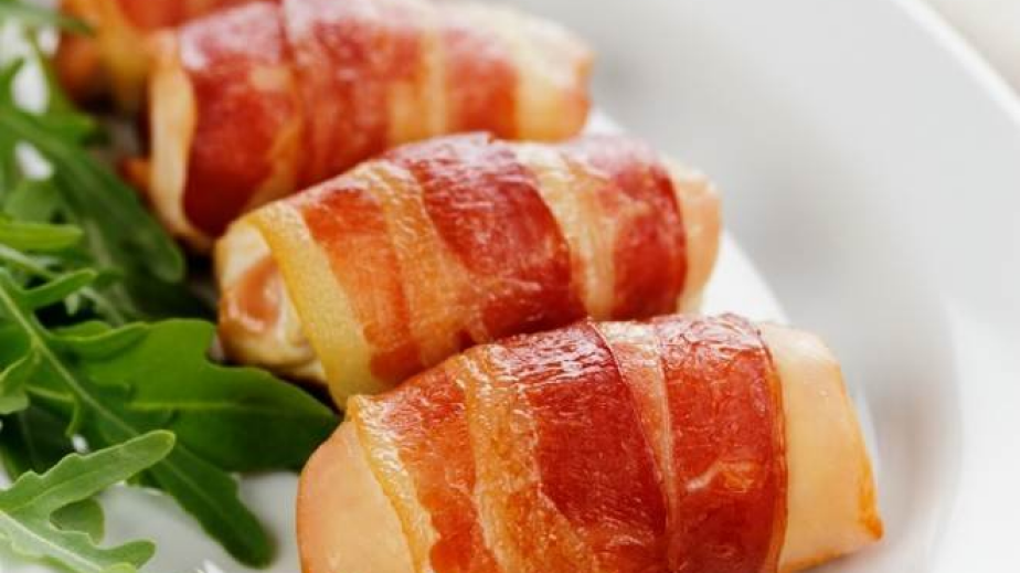 Слагаме пилешките гърди в дълбок съд и към тях прибавяме предварително нарязания кромид лук и подправките за пиле. Оставяме ги да се сварят, след което ги изваждаме от тенджерата и ги оставяме леко да изстинат. Накъсваме месото на малки парчета. Върху всяко парче бекон слагаме пилешко месо, след което го завиваме на малко рулце. Сипваме олио в тава и подреждаме рулцата в нея. Преди да започнем печенето, ги заливаме със сметана за готвене. Загряваме фурната на 180º и запичаме 10–15 мин.