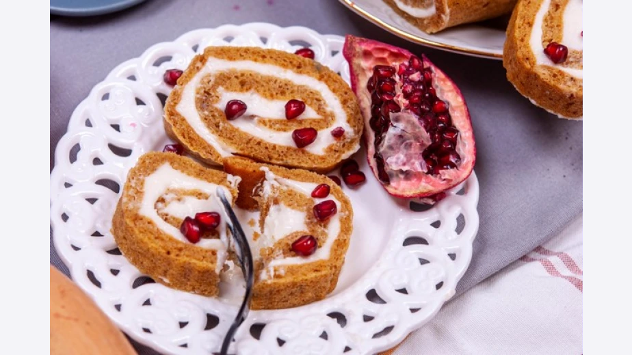 С миксер разбивате яйцата, заедно със захарта за около 2-3 минути за по-висока степен, след което на по-ниска добавете пюрето от тиква и разбъркайте за около минута. Добавете сухите съставки към течната смес и разбърквай до получаване на хомогенна смес. В тава поставете хартия за печене, намажете леко с олио и изсипете сместа, като я разстелете на равномерен блат. Печете в предварително загрята на 170 градуса фурна за около 12-15 минути, докато блатът придобие апетитен златист цвят. За да не се напука по-късно рулото при навиване, навийте изпечения блат на руло без да махате хартията за печене, докато е още топъл и го оставете да изстине на страна.